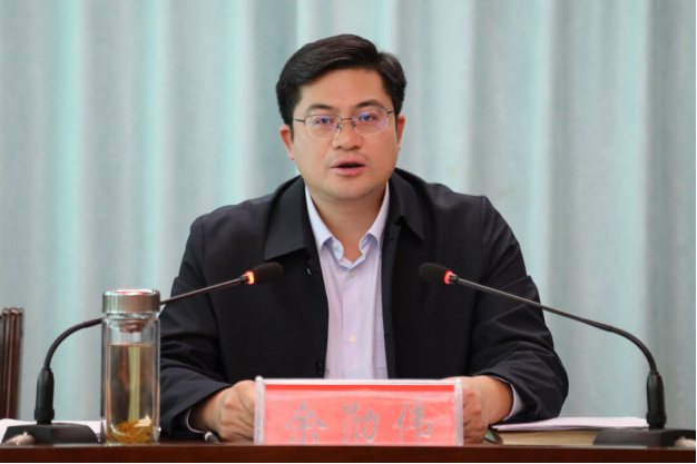 图为县委书记余勋伟在会上讲话