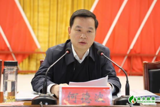 图为县委书记何德波在会上讲话